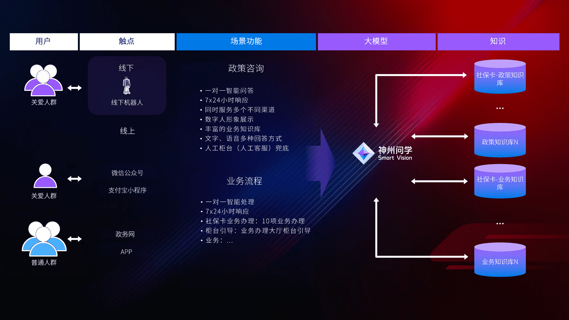 • 利用大语言模型+RAG技术,,,,支持多轮对话,,,,可识别多种同义词、、近义词,,精准理解关爱人群语义快速输出结果。。