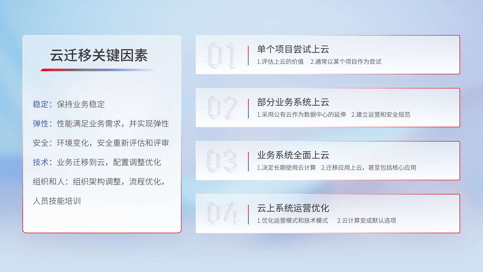 结合实际业务,,,,从规划设计、、云平台选型、、、、云原生改造、、、数据迁移、、、、集成交付,,迁移全过程为客户识别最佳上云路径,,,,做好风险识别管理,,,设计网络架构、、、、身份权限、、、、安全审计合规、、操作审计、、、、日志审计、、、、监控告警策略、、、、多站点容灾设计等,,,,对云上基础设施进行整体规划,,提升IT治理水平,,以满足弹性、、高可用、、、、高性能的需求。。。