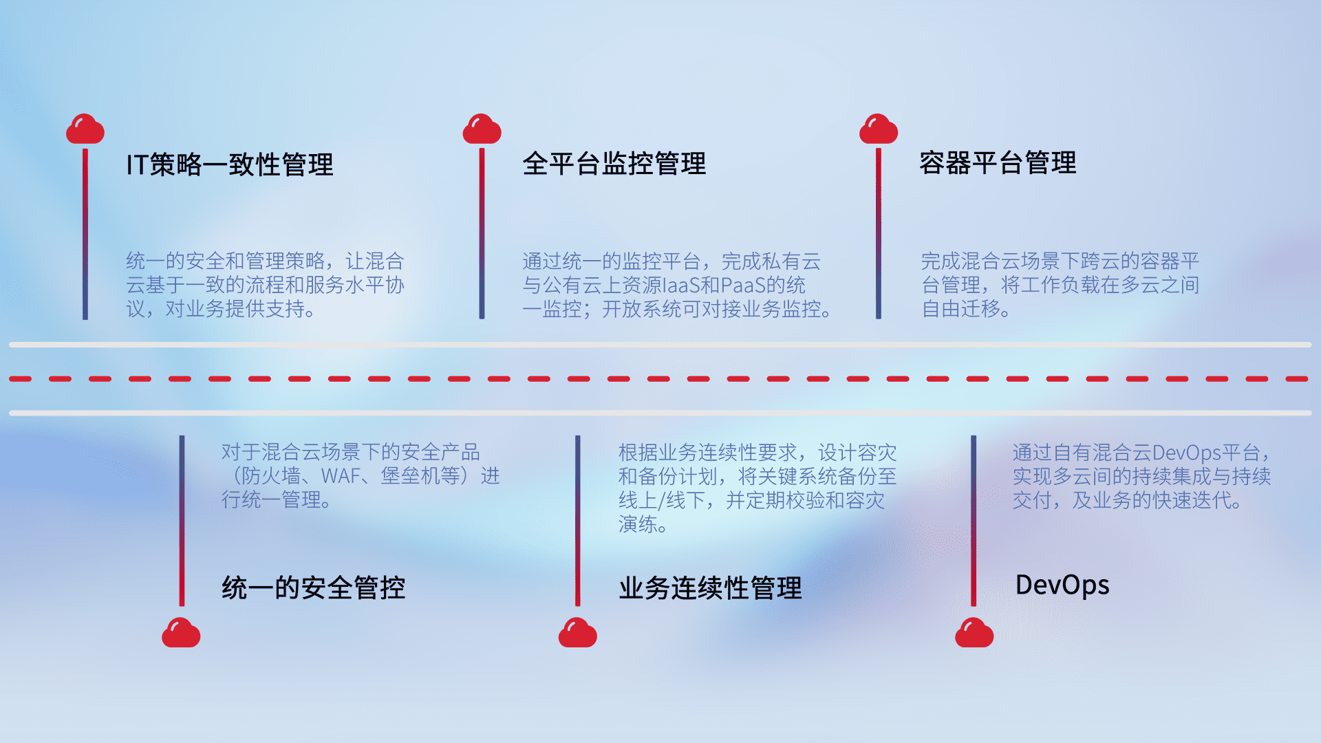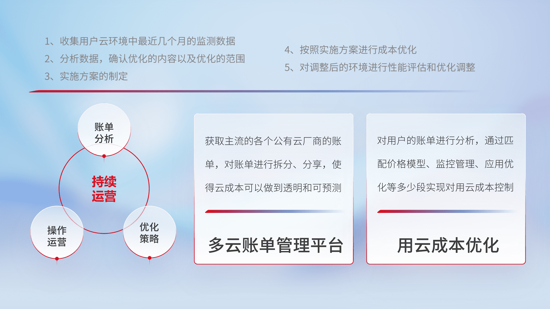 通过多云纳管,,,,以统一的资源数据模型把客户的云资源进行抽象和封装,,进而实现对多云资源的统一操作,,,保障云资源管理的可靠性、、稳定性与可用性。。。量身定制化运维内容,,,配置、、、开发运维、、、、补丁管理、、备份、、监控、、、认证和访问管理、、、审计和日常巡检等,,保障在用云过程中的可靠度,,稳定度以及高可用率。。